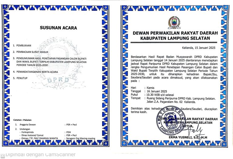 Kalianda – DRPD Kabupaten Lampung Selatan telah meng-agendakan sidang (rapat) paripurna dalam rangka penetapan calon Bupati – Wakil Bupati terpilih periode 2025-2030 yaitu pada Hari Kamis 16 Januari 2025 pukul 10.30 WIB sampai selesai bertempat di ruang sidang DPRD Lampung Selatan.