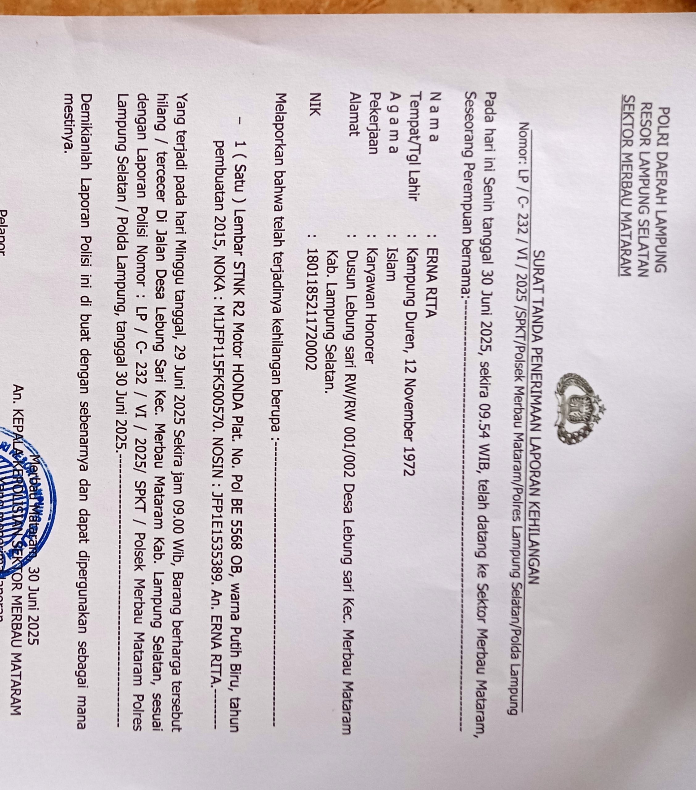 STNK hilang tercecer di sekitar Jalan désa Lebung Sari kecamatan Merbau Mataram kabupaten Lampung Selatan, diketahui hilang pada hari Minggu, 29 Juni 2025.