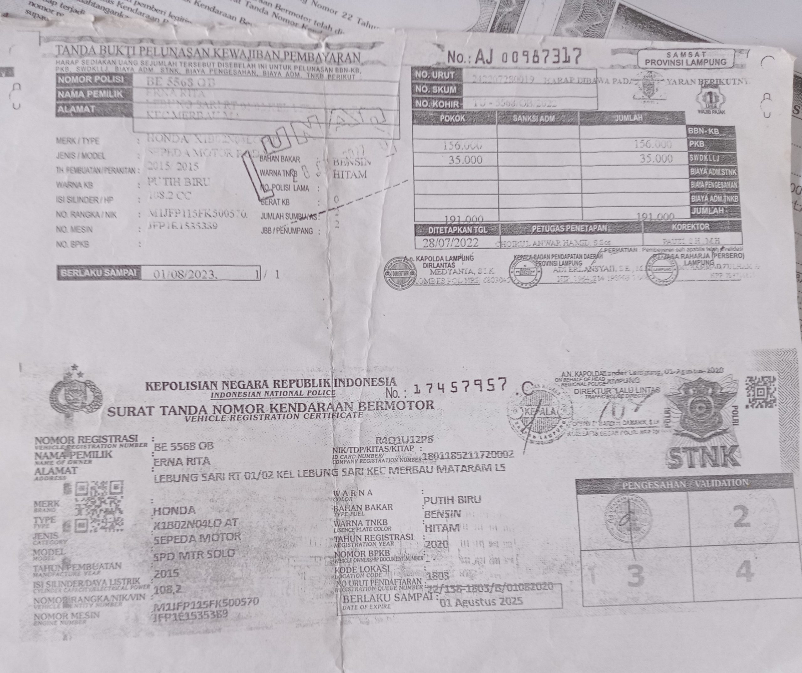 MEDIA RI, LAMSEL_Telah kehilangan Surat Tanda Nomor Kendaraan (STNK) R 2 Motor No. Pol. BE 5568 OB tipe Honda tahun pembuatan 2015, warna putih biru atas nama Erna Rita.