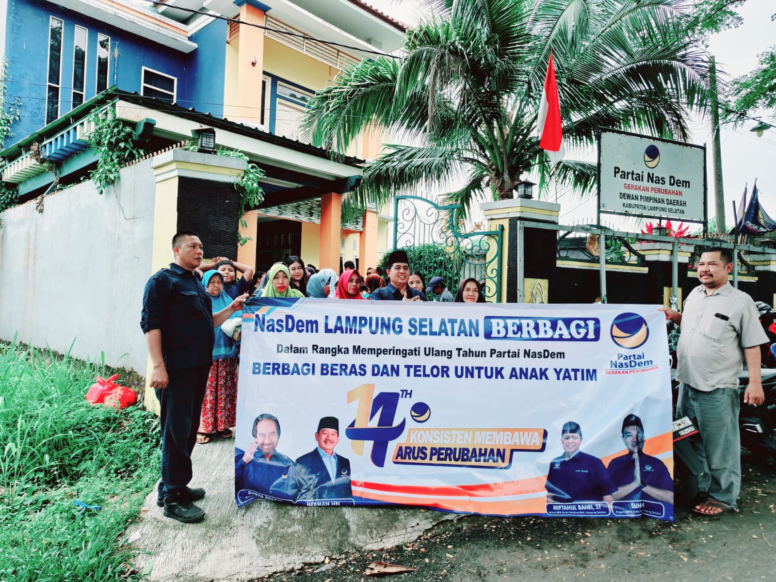 Rayakan HUT NasDem ke-14, DPD Lampung Selatan Berbagi Sembako dan Beasiswa untuk Warga