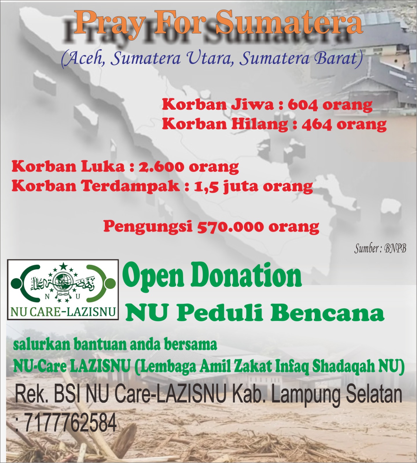 LAZISNU mengajak warga Lampung Selatan untuk menyalurkan zakat, infak, dan sedekah melalui Open Donation NU Peduli Bencana ke Rekening BSI 7177762584 a.n. LAZISNU PCNU Kabupaten Lampung Selatan.