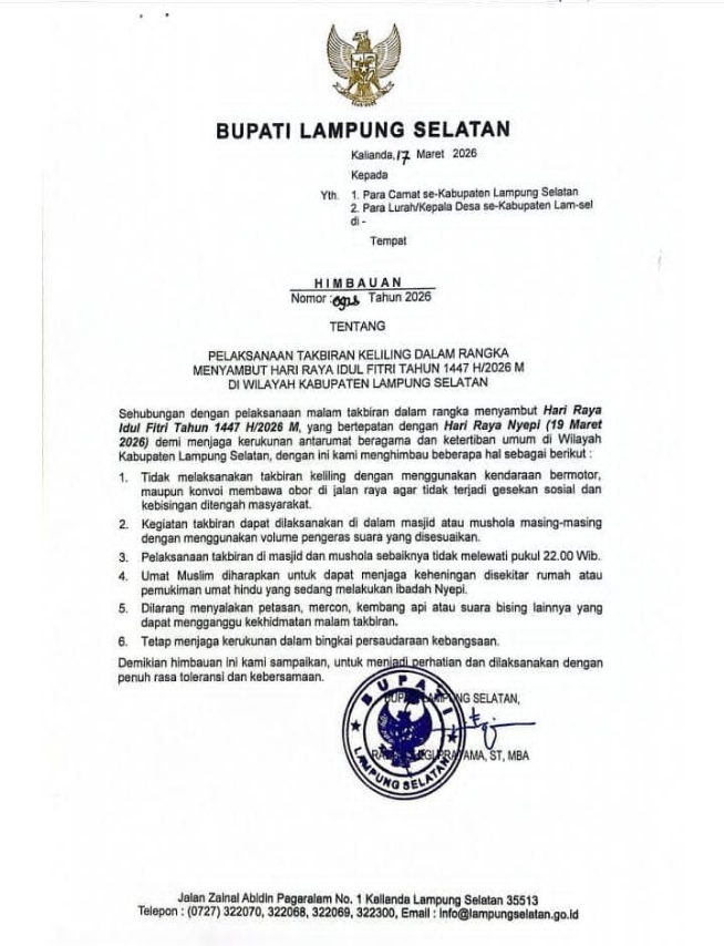 ‎”Dalam rangka menjaga kerukunan antar umat beragama dan ketertiban umum di wilayah kabupaten Lampung Selatan,” tulis Bupati Raditiyo Egi Pratama.Selasa (17/03/2026).