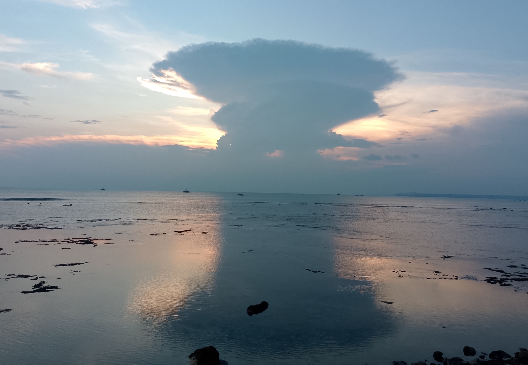 Lampung Selatan — Suasana senja di betangan penahan ombak Pesisir Kalianda bawah hingga Desa Maja Kamis sore ini menyuguhkan pemandangan tak biasa. Formasi awan berbentuk “jamur raksasa” atau cumulonimbus incus tampak berdiri megah di ufuk barat, dengan pantulan sempurna di permukaan laut yang tenang saat air surut.