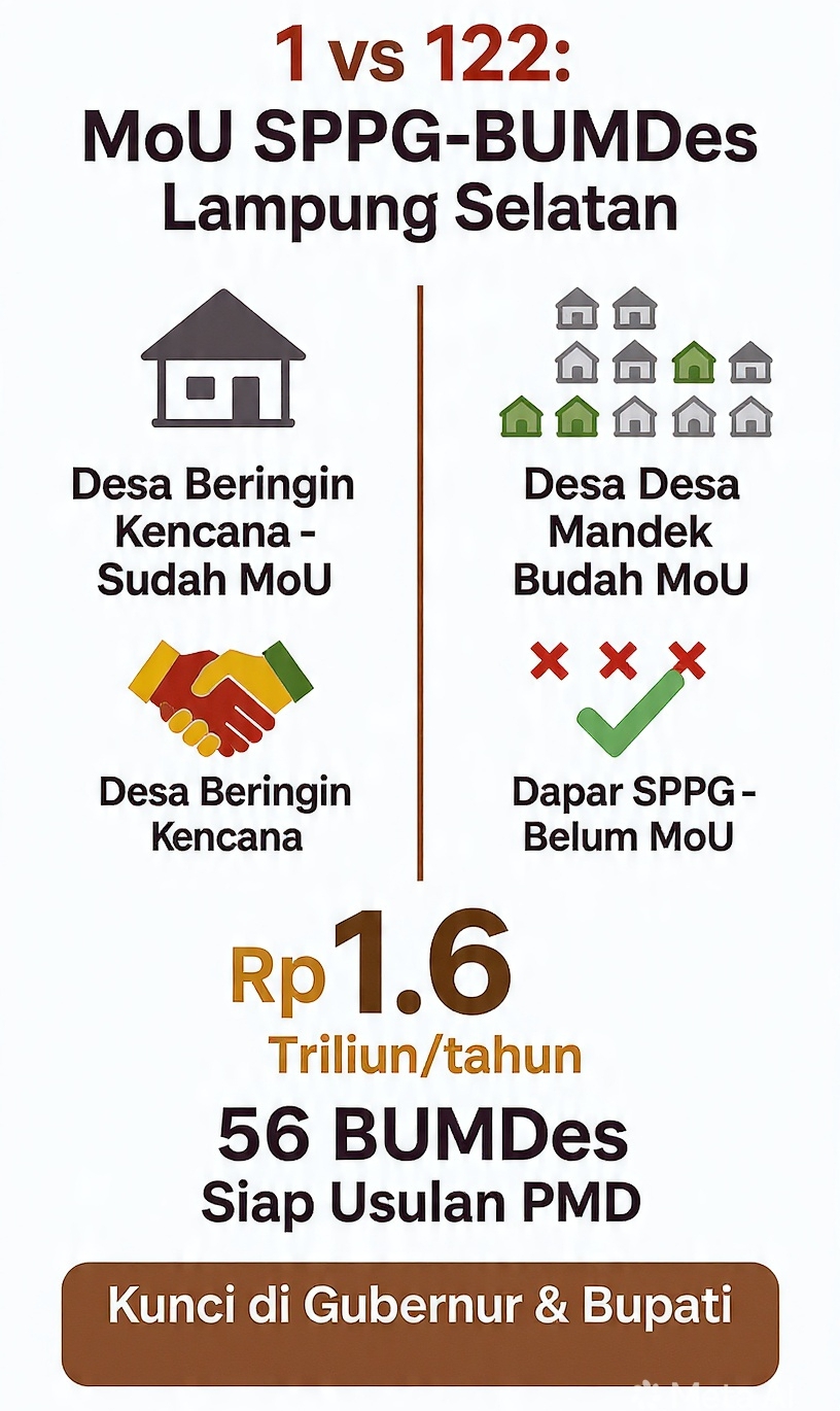 Sumber di lapangan menyebut lambannya penunjukan BUMDes terkendala dua hal. Pertama, semua pihak menunggu arahan tertulis dari Gubernur Lampung karena MBG adalah program pusat. Kedua, BUMDes butuh jaminan pasar dan kepastian harga.
